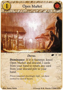 Open MarketType: Location House: Martell Cost:1 Game Text: Dorne. Dominance: If it is Summer, kneel Open Market and discard 2 cards from your hand to return any card from your discard pile to your hand. Flavor Text: Prices remained shockingly high... yet there seemed no lack of buyers. Number: 19 Set: ASoS Quantity: 1 Illustrator: Jonny Klein |