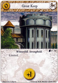 Great KeepType: Location House: Stark Cost:0 Game Text: Winterfell. Stronghold. Limited. +1 Income. Number: 30 Set: LoW Quantity: 3 Illustrator: Eric Lofgren |