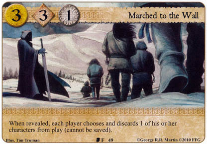 Marched to the WallType: Plot House: Neutral Income:3 Initiative: 3 Claim: 1 Game Text: When revealed, each player chooses and discards 1 of his or her characters from play (cannot be saved). Number: 49 Set: LoW Quantity: 3 Illustrator: Tim Truman |