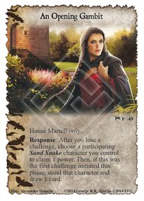 An Opening GambitType: Event House: Martell Cost: Game Text: House Martell only. Response: After you lose a challenge, choose a participating Sand Snake character you control to claim 1 power. Then, if this was the first challenge initiated this phase, stand that character and draw 1 card. Number: 49 Set: The Valemen Quantity: 3 Illustrator: Alexandre Dainche |