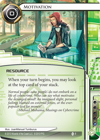 The question of what the smack to do with Motivation haunted us from GenCon (we got our Opening Moves early) until just a week back, when Second Thoughts was released and we got a gander at Eureka! (Second Thoughts) For those of you who don't know (and, apparently, can't follow a link), Eureka! is a double Event that allows you to reveal the top card of your Stack and install it if able, lowering the cost by 10 credits. So, here's an actual, honest-to-Wotan (Second Thoughts) use for Motivation, a reason that knowing what the top card of your deck happens to be would be good. Ish. Goodish.