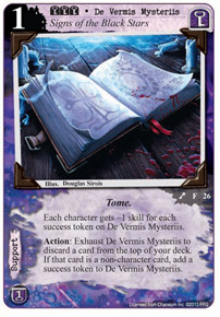 - De Vermis Mysteriis is non-unique, but don’t go crazy with it! Only trigger it enough to get a good global skill reduction like 2 or 3. It’s there to supplement your skill-based destruction stuff and force your opponent to only commit big dudes to hope for a slim success at a story. Honestly, you're odds of getting the effect are usually less than 50% without some sort of filtering, which is what Prism and Journey are for.
