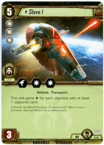 The objective itself is passable – a standard 5/1 with a useful ability that can sometimes be a game-changer. Depending on how much capture capability you’re sporting, this can net you some decent card advantage. Even one Bounty or Capture can be a huge boon to your draws. The rest of his set is a balanced mix, featuring an ever-important resource, a small unit, a good support unit, and an Edge trick. Overall, it’s certainly not the best set S&V has to offer, but it compliments Jabba nicely and provides a good foundation to build from. Jabba’s Pleasure Barge (81-3), in particular, has obvious synergy with Jabba’s printed action, as well as a number of other new S&V cards (Bossk stands out). The resource is a very attractive feature, especially in a set with a 5 cost character. In general, it’s very hard for me to turn down resource sets, and I feel like many players severely underestimate how important it is to have enough resources in a deck – especially a deck that runs expensive units. Killing Cold/ Trooper builds can get away with a skeleton resource set, but most decks will find it very hard to operate without 5-8, depending on your overall costs.