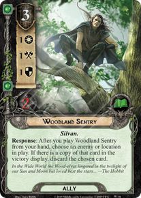Type: Ally Sphere: Lore Cost: 3 Willpower: 1 Attack: 1 Defense: 1 Hit Points: 2 Silvan. Response: After you play Woodland Sentry from your hand, choose an enemy or location in play. If there is a copy of that card in the victory display, discard the chosen card. In the Wide World the Wood-elves lingered in the twilight of our Sun and Moon but loved best the stars... -The Hobbit Set: The City of Ulfast Number: 30 Quantity: 3 Illustrator: Sara Biddle |