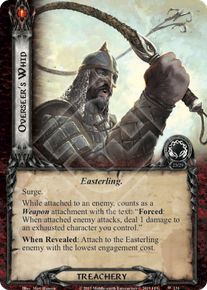 Type: Treachery Encounter Set: The Land of Sorrow Easterling. Surge. While attached to an enemy, counts as a Weapon attachment with the text: “Forced: When attached enemy attacks, deal 1 damage to an exhausted character you control.” When Revealed: Attach to the Easterling enemy with the lowest engagement cost. Set: The Land of Sorrow Number: 131 Quantity: 2 Illustrator: Matt Hansen |