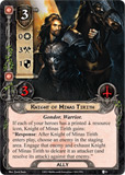 If each of your heroes has a printed [Tactics] resource icon, Knight of Minas Tirith gains: "Response: After Knight of Minas Tirith enters play, choose an enemy in the staging area. Engage that enemy and exhaust Knight of Minas Tirith to declare it as attacker (and resolve its attack) against that enemy."