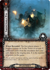 ![]() Type: Treachery Encounter Set: The Morgul Vale When Revealed: The first player places 3 progress tokens on To the Tower or reveals X additional cards from the encounter deck and adds them to the staging area. X is the number of players in the game. The air above was heavy with fog, and a reek lay on the land about them. –The Two Towers Set: TMV Number: 157 Quantity: 2 Illustrator: Oleg Saakyan |