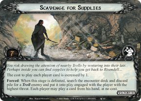 Type: Side Quest Encounter Set: Across the Ettenmoors The cost to play each player card is increased by 1. Forced: When this stage is defeated, search the encounter deck and discard pile for a Troll enemy and put it into play engaged with the player with the highest threat. Each player may play a card from his hand, at no cost. You risk drawing the attention of nearby Trolls by venturing into their lair. Perhaps inside you can find supplies to help you get back to Rivendell... Set: Across the Ettenmoors Number: 83 Quantity: 1 Illustrator: Marcel Mercado |