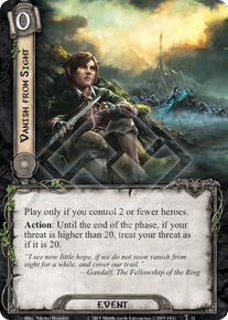 ![]() Type: Event Sphere: Neutral Cost: 0 Play only if you control 2 or fewer heroes. Action: Until the end of the phase, if your threat is higher than 20, treat your threat as if it is 20. “I see now little hope, if we do not soon vanish from sight for a while, and cover our trail.†—Gandalf, The Fellowship of the Ring Set: Flight of the Stormcaller Number: 11 Quantity: 3 Illustrator: Nikolas Hagialas |