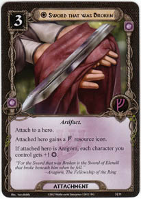 Type: Attachment Sphere: Leadership Cost: 3 Artifact. Attach to a hero. Attached hero gains a [Leadership] resource icon. If attached hero is Aragorn, each character you control gets +1 [Willpower]. "For the Sword that was Broken is the Sword of Elendil that broke beneath him when he fell." - Aragorn, The Fellowship of the Ring Set: TWitW Number: 55 Quantity: 3 Illustrator: Sara Biddle |