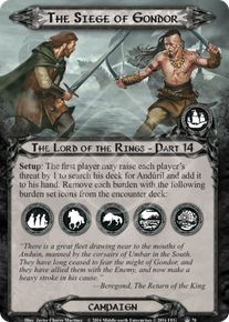 ![]() Type: Campaign Encounter Set: The Siege of Gondor Setup: The first player may raise each player’s threat by 1 to search his deck for Anduril and add it to his hand. Remove each burden with these burden set icons from the encounter deck: A Shadow of the Past, Flight to the Ford, The Ring Goes South, The Passage of the Marshes, Shelob’s Lair “There is a great fleet drawing near to the mouths of Anduin, manned by the corsairs of Umbar in the South. They have long ceased to fear the might of Gondor, and they have allied them with the Enemy, and now make a heavy stroke in his cause.” -Beregond, The Return of the King Set: The Flame of the West Number: 70 Quantity: 1 Illustrator: Javier Charro Martinez |