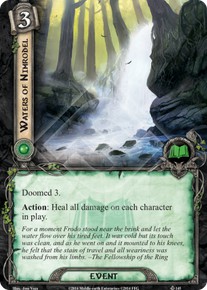 Type: Event Sphere: Lore Cost: 3 Doomed 3. Action: Heal all damage on each character in play. For a moment Frodo stood near the brink and let the water flow over his tired feet. It was cold but its touch was clean, and as he went on and it mounted to his knees, he felt that the stain of travel and all weariness was washed from his limbs. -The Fellowship of the Ring Set: The Antlered Crown Number: 145 Quantity: 3 Illustrator: Jose Vega |