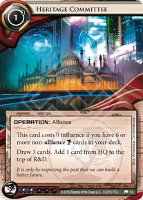 Heritage CommitteeType: Operation: Alliance Cost: 1 Faction: Corp Jinteki Faction Cost: 2 This card costs 0 influence if you have 6 or more non-alliance Jinteki cards in your deck. Draw 3 cards. Add 1 card from HQ to the top of R&D. It is only by respecting the past that we can build a better future. Set: Kala Ghoda Number: 13 Quantity: Illustrator: Anastasia Ovchinnikova |
