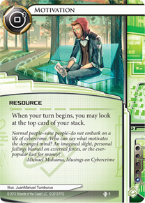 MotivationType: Resource Cost: 0 Faction: Runner Shaper Faction Cost: 1 When your turn begins, you may look at the top card of your stack. Set: Opening Moves Number: 008 Quantity: 3 Illustrator: JuanManuel Tumburus |