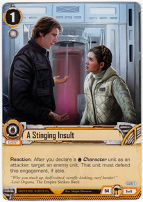 A Stinging InsultType: Event Cost: 1 Force Icons: 1 Faction: Light Smugglers and Spies Reaction: After you declare a [Smugglers and Spies] Character unit as an attacker, target an enemy unit. That unit must defend this engagement, if able. "Why you stuck up, half-witted, scruffy-looking, nerf herder!" - Leia Organa, The Empire Strikes Back Block Number: 54 - 5 of 6 Set: Assault on Echo Base Number: 261 Illustrator: Magali Villeneuve |