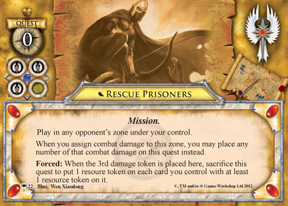 Forced: When the 3rd damage token is placed here, sacrifice this quest to put 1 resource token on each card you control with at least 1 resource token on it.
