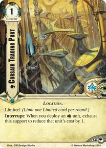 Corsair Trading PortType: Support Faction: Eldar Cost: 1 Signature/Loyalty: --- Traits: Location. Limited. (Limit one Limited card per round.) Interrupt: When you deploy an [ELDAR] unit, exhaust this support to reduce that unit’s cost by 1. Set: Core Set Number: 144 Quantity: 1 Illustrator: GW Design Studio |