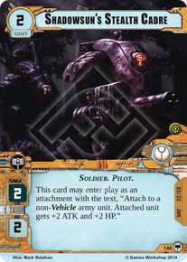 Shadowsun’s Stealth CadreType: Army Unit Faction: Tau Cost: 2 Attack Value: 2 Hit Points: 2 Command Icons: 1 Signature/Loyalty: Signature Icon Traits: Soldier. Pilot. This card may enter play as an attachment with the text, “Attach to a non-Vehicle army unit. Attached unit gets +2 ATK and +2 HP.” Set: Core Set Number: 146 Quantity: 4 Illustrator: Mark Bulahao |