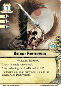 Autarch PowerswordType: Attachment Faction: Eldar Cost: 1 Shields: 3 Signature/Loyalty: Signature Icon Traits: Wargear. Weapon. Attach to an a unit you control. Attached unit gets +1 ATK and +1 HP. If attached unit is an army unit it, gains the Warrior and Psyker traits. Set: The Final Gambit Number: 121 Quantity: 1 Illustrator: GW Design Studio |