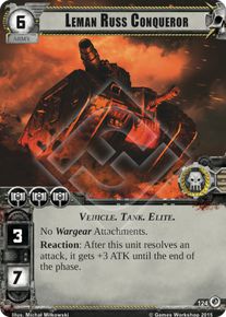 Leman Russ ConquerorType: Army Unit Faction: Astra Militarum Cost: 6 Attack Value: 3 Hit Points: 7 Command Icons: 3 Signature/Loyalty: Traits: Vehicle. Tank. Elite. No Wargear Attachments. Reaction: After this unit resolves an attack, it gets +3 ATK until the end of the phase. Set: The Final Gambit Number: 124 Quantity: 3 Illustrator: Michał Miłkowski |