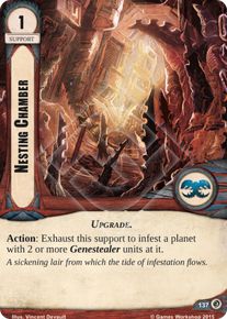 Nesting ChamberType: Support Faction: Tyranids Cost: 1 Signature/Loyalty: Traits: Upgrade. Action: Exhaust this support to infest the planet with 2 or more Genestealer units at it. A sickening lair from which the tide of infestation flows. Set: The Final Gambit Number: 137 Quantity: 3 Illustrator: Vincent Devault |