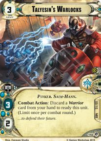 Talyesin’s WarlocksType: Army Unit Faction: Eldar Cost: 3 Attack Value: 3 Hit Points: 2 Command Icons: 1 Signature/Loyalty: Signature Icon Traits: Psyker. Saim-Hann. Combat Action: Discard a Warrior card from your hand to ready this unit. (Limit once per combat round.) ...to defend their future. Set: The Final Gambit Number: 118 Quantity: 2 Illustrator: Caravan Studio |