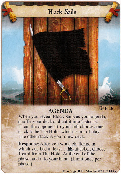 So this week we’re taking the opportunity to explore one of the brand new cards from the current cycle. So far, I’ve been enjoying the entire cycle, but one card in particular spoke to my Shagga sensibilities. In the first pack, the new agenda, The Black Sails, joined the fray and it immediately tripped the Shagga-radar. Now, it doesn’t exactly set up or otherwise power a combo by itself (and I’d be wary of relying on it for that due to the random nature of the Hold) but it surely does encourage one of my other favorite things- splashing! Let’s take a look.