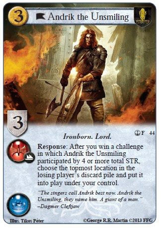 Island Smuggler (MotM) - Surprisingly useful against recursion decks. He might not last long against Targaryen if they have Flame Kissed handy, but otherwise, he can really put a crimp on recursion happy Targaryen, Martell and Baratheon decks.