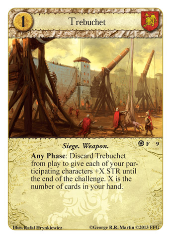 We Take Westeros!- If ever there was a card to take advantage of colossal strength boosts, this is it. We Take Westeros! thrives on boosts like that of Trebuchet that affect a large number of characters at once. With the right pumps and a large enough character base, We Take Westeros! can help you mill for 30+ cards in one swing. That won’t always end a game outright, but once your opponent has already had Setup, and then drawn for a couple turns, there won’t be much left for you to mop up. Bonus points then if you can either play WTW! for a large enough number to blow them out in one turn, or at least follow up with a second copy of the event on the next turn.