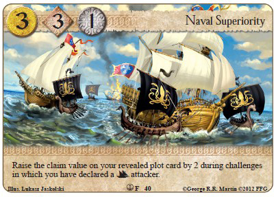 Victarion Greyjoy (RotK)/ Naval Superiority (TGF) - Sure, they do require naval enhancements, which Lannister doesn’t have a ton of right now, but they’re a great way to raise claim and Naval Superiority becoming a 3 claim plot is pretty impressive as far as plots go.