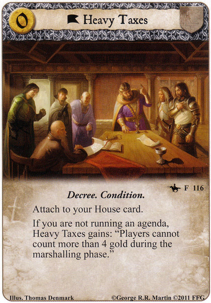 Heavy Taxes is a tricky card, as it requires that you not run an agenda with your deck to work. Although this seems like an immediate drawback in many cases, one of the strengths of Heavy Taxes is that it does not count as an agenda once it is attached. This allows cards that get a bonus from not running an agenda to still work, such as Rickard Karstark (WLL) or Damon Dance-For-Me (VD). The Red Viper (TftRK)'s ability will still trigger if you have Heavy Taxes, allowing you to trigger the feared combo with No Use For Grief (DB) in a Sand Snake deck. Getting it into play early is crucial for it to be effective, so it should be assisted with the Spending the Winter Stores (QoD) plot.