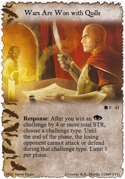 The first of these ways is Lannister's dominance of the Intrigue challenge. The Intrigue challenge seeks to reduce the opponent's cards in hand and therefore the options they have going forward. Similar to the way in which House Lannister sought to outmaneuver opponents without even having to do battle, the LCG's House Lannister seeks to destroy your cards before they can even be mustered. Their agenda, The Power Behind the Throne (LotR), helps them do this exceptionally well--they can mount two assaults on your options each and every turn. Using cards like Maester Creylen (FtC) and Cersei Lannister (LotR), such Intrigue assaults can double as power grab for your house....mastering that game certainly put House Lannister in good stead within the saga. (side note: Is anyone else bothered that Cersei Lannister is one of the best characters in the game during intrigue challenges when she is clearly incompetent in the books? I guess I can't have everything I wish for....)