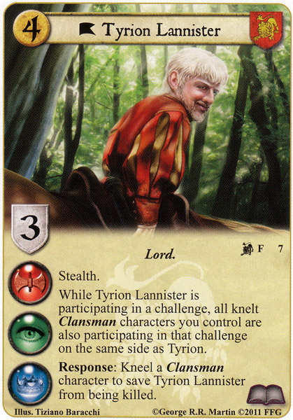According to my (many) hours spent surfing the Song of Ice and Fire fan pages, Tyrion Lannister (LotR) remains one of the best-loved characters in the series. I know he certainly is one of mine. And what is Tyrion without his Clansmen? These simple, loyal, straightforward characters follow Tyrion and do his bidding. They amplify Lannister in the themes where they are traditionally thin (namely, military) and get bonuses to be weak where Lannister is typically strong (such as card draw). This backwards way of playing Lannister almost is a mirror image of Tyrion's lot within the House's hierarchy. Never beloved by his father despite his obvious talents, Tyrion finds a niche with the Clansmen. It certainly is an unlikely alliance--almost as unlikely as a military/aggro Lannister deck! And, just as one would expect, FFG has printed a Tyrion who synergizes excellently with Clansmen....an unlikely hero for an unlikely deck.