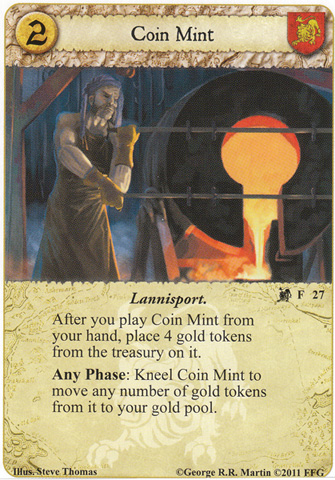 Given this lack of a focal point for the deck, I decided to look back to Tywin himself for inspiration. Alright, ser, I'll stick three of you in and see how that goes. I used the Lions of the Rock version since the Shadows one is pretty niche and the Core one pretty terrible. Tywin Lannister (LotR) is strong, but hard to trigger. One thing you'll need consistently is gold in your pool, and Lannister excels at that. Just as Tywin used his own personal fortune to subsidize the Iron Throne, in this deck he's using Lannisport Treasuries, Goldroads, and Weaponsmiths to fill the coffers. I also find Coin Mint (LotR) to be a nice way to get gold into your pool anytime you need it, such as for Tywin's power grab. Daven Lannister (GotC) is often worthwhile in these types of decks, but, since he's off sieging Riverrun, I left him out.