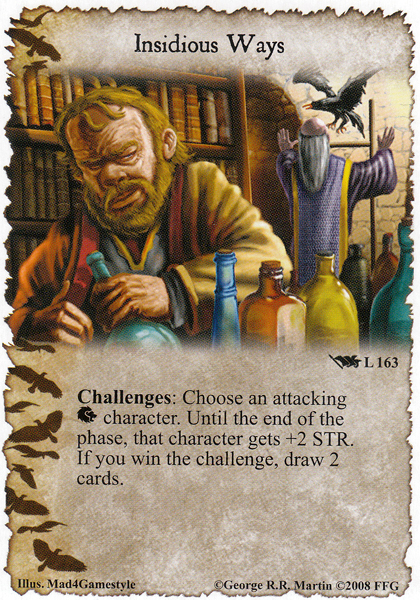 This card is a welcome addition to aggressive Lannister decks and fits right in to the Clansman theme. For Clansman, Insidious Ways draws cards, boosts strength, and also drops the card count by 1 temporarily, which can be handy for the Burned Men. Insidious Ways as a first action against Targ can help ward off defensive burn (at least until the challenge resolves).