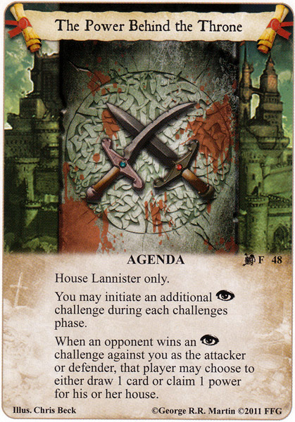 Lots of uses for this. Block on a Shadows and Spiders turn, give Cersei power, trigger Lannisport Tourney Grounds, get an extra kill on Frey Hospitality... besides that, like Rule by Decree, this card also gives you good insurance, in case you end up matched up against another intrigue heavy deck, (or even another PBTT, where you will get a HUGE advantage if your opponent also didn't slot it.)