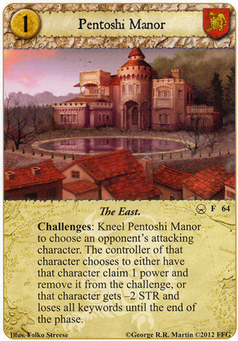 Deciding what restricted card to put in a Lannister deck got much harder. While each deck will call for a different choice, the way I see it, we now have to choose between the Pentoshi Manors, Pyromancer's Cache, Mountain Refugee, Search and Detain, and maybe Retaliation. Retaliation made the list because it is strong in kneel decks and its a four-gold-two-claim that used to be in every deck. Under no circumstances would I play Castellan over Pentoshi Manor as they serve almost the same purpose but Manors are cheaper, less easily removed, and don't use your limited response.