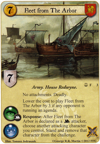 There a few potential subthemes worth exploring if you’re feeling adventurous. House Lannister gained one of the better fleets, Fleet from The Arbor (RotK), and it can be paired with The Burned Men (MotM), Painted Dogs (IG), Manning the City Walls (CD), Muster the Realm! (QoD) to give your deck an army flavor. One the other hand, shadows-centric cards like Cersei Lannister (AToT) and Alchemist's Guild Hall (TBoBB) provide an alternative method for kneeling out our opponent’s board.