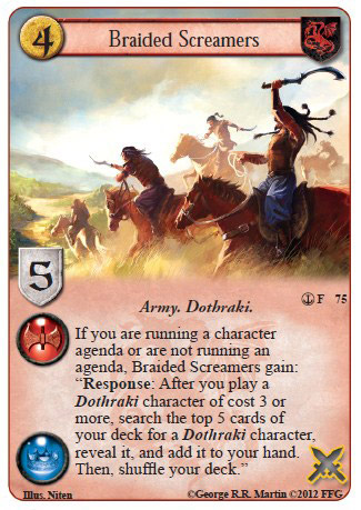 Blood Magic Ritual: Since the errata, the singular best card to use this with is Khal Drogo (QoD). Bringing him back do die again is amazing. The second best card is likely Braided Screamers, conveniently both in this deck. This is still a great card and its setup-friendliness means I run it at 2x.