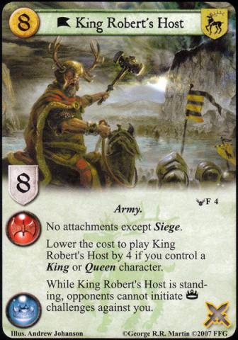 King Robert's Host (TWot5K) – It's big (hard to burn), often cheap (all Baratheon decks tend to run at least one King) and locks out a whole challenge type while standing. Certainly something you should consider, especially in combination with See who is Stronger (KotStorm) or other Army-tech.