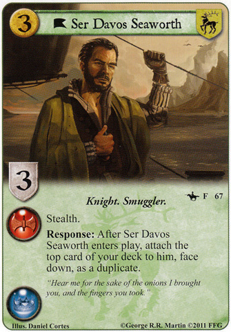 Ser Davos Seaworth (Core) – One of the early defining cards of Baratheon prevention. Bonus points for also working against burn, but lacks the all important stealth keyword shared by it's two competitors.