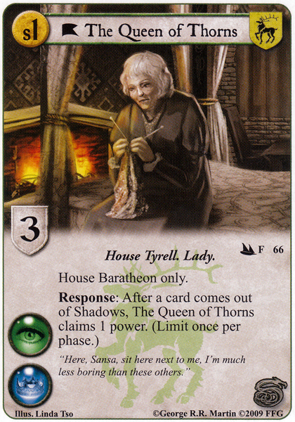 The Queen of Thorns (TftRK) – In books she likes to stay out of the spotlight and in Shadows, pulling strings and orchestrating plots. In the game her true strength is a steady stream of power from cards popping in and out from shadows. Also she can trigger the first power from herself when coming out of shadows, so she functions nicely as a closer.