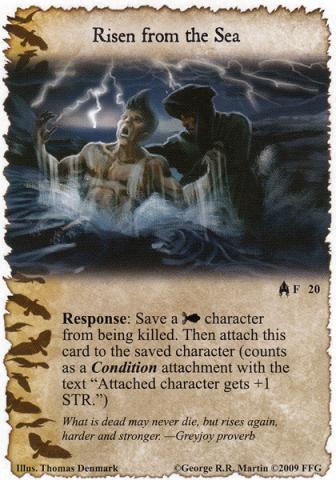 While I had a specific matchup section, my mind is still blown by the alterations that are going to have to come to some top tier decks, so I'll just speak generally. The weaknesses of this deck are almost always card draw and power grabbing. Despite power of faith almost always being associated with rushes, I think this deck works better over a longer game where the power of your saves and resilience can really shine. For card draw, Aeron is great, though the opponent will frequently just stop military challenges that have a result of kneeling Maester Wendamyr (KotS) to feed you cards. The draw boats end up feeling like a must. Also, it is critical to notice that the motto is "what is dead can never die." What is dead can most certainly be discarded... Burn decks are 0 fun, though Moqorro (VD) gives some glimmer of hope...