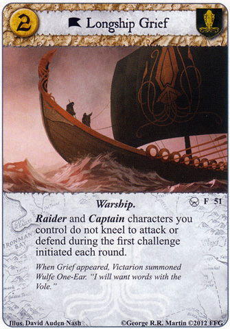 Amongst all the buzz about new mechanics, new agendas and new FAQs one little thing has gone pretty much totally unnoticed as of late--the last two cycles have slowly but surely added more support to Greyjoy's raider theme, originally introduced way back in the brotherhood cycle. Victarion's Reavers (CD), Iron Fleet Captain (CD) and Ironborn Marauder (TGF) have all joined the card pool as completely reasonable characters with the raider trait and this very last chapter pack gave us yet another powerful raider character, the Raiders of Orkmont (AToTT). Likely a greater boost than any of these characters, though, has come in the form of a location, and it will be the focus of our column's deck today: Longship Grief (CD)