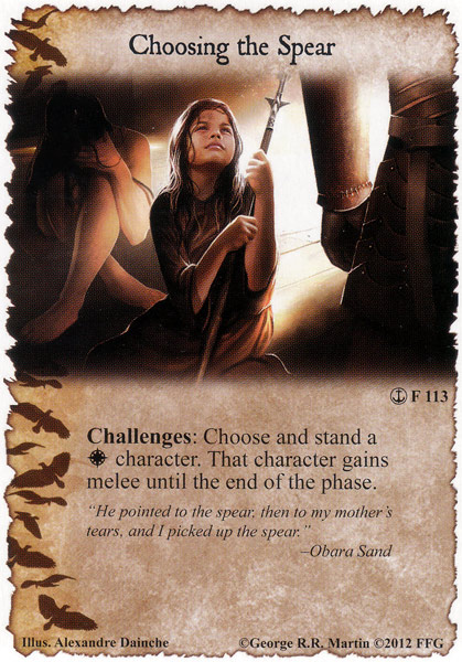 1. Choosing the Spear (AJE) - This goes in every Martell deck at this point. Standing for surprise offense, standing to win surprise defense (thanks Melee!), rushing, getting extra use of big claim... this card is just straight up dominant.