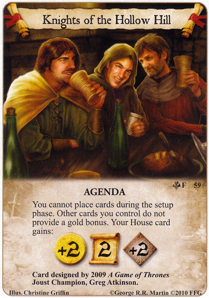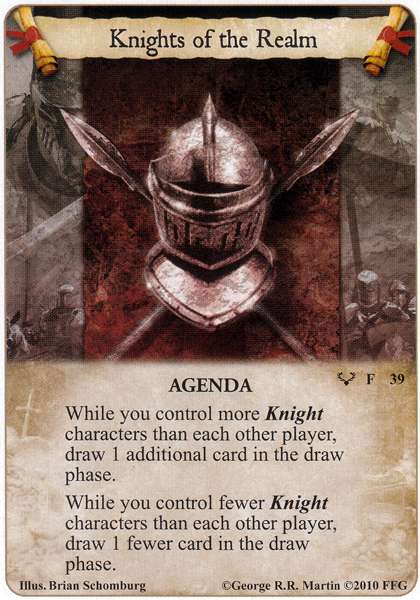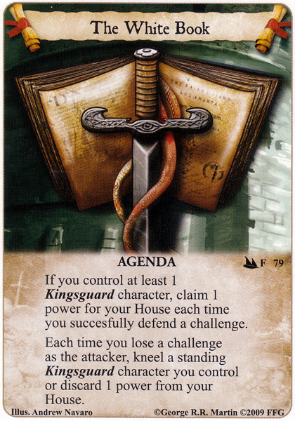 If you ask me this is really a Lannister agenda. Since the large majority of the Kingsguard characters are neutral you need a better gold curve to get them out. Additionally several more of them are also Lannister affiliated. The agenda is workable in Martell but far from optimal; also much like Brotherhood Without Banners it’s tied to a really specific deck type.