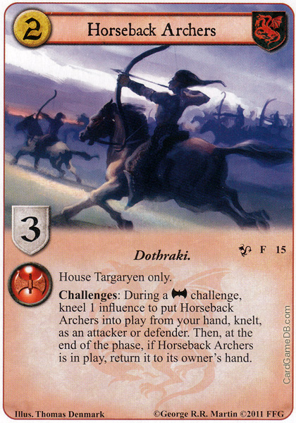 Currently, there are 19 cards with the Ambush keyword, and that means it's a guessing game for your opponents to figure out just which ones you're using. True, a Dothraki deck is more obvious than others, but that's actually the psychological strength of the deck. If I know the Targ player has a Dothraki horde in front of me, then it's a sure thing that there is some Ambush weaponry available, as well as the best card ever, Horseback Archers (QoD). The very threat of these cards makes your opponents less likely to attack you or even defend, because they're so afraid of what they can't see. Do they focus the lens elsewhere or take a chance on getting bitten by extra strength they didn't count?