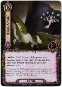 Type: Event Sphere: Leadership Cost: 0 Action: Until the end of the phase, each Gondor card in play gains the Rohan trait, and each Rohan card in play gains the Gondor trait. "These are the Rohirrim, as we name them, masters of horses... and have ever proved true to us, aiding us at need, and guarding our northern marches and the Gap of Rohan." - Faramir, The Two Towers Set: HON Number: 5 Quantity: 3 Illustrator: Derek Zabrocki |