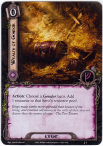 Type: Event Sphere: Leadership Cost: 0 Action: Choose a Gondor hero. Add 1 resource to that hero's resource pool. Kings made tombs more splendid than houses of the living, and counted old names in the rolls of their descent dearer than the names of sons. - The Two Towers Set: HON Number: 6 Quantity: 3 Illustrator: Derek Zabrocki |