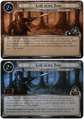 Type: Quest Encounter Set: Flies and Spiders Encounter Info: Flies and Spiders, Wilderland Quest Points: - When Revealed: Reveal stage 3 and create a separate staging area for the first player using that stage. Then, all other players advance to stage 4. The nights were the worst. It then became pitch-dark - not what you call pitch-dark, but really pitch, so black that you really could see nothing. Bilbo tried flapping his hand in front of his nose but he could not see it at all. Well, perhaps it is not true to say they could see nothing: they could see eyes. -The Hobbit ... the cries of the others got steadily further and fainter, and though after a while it seemed to him they changed to yells and cries for help in the far distance, all noise at last died right away, and he was left alone in complete silence and darkness. - The Hobbit Set: OtD Number: 68 Quantity: 1 Illustrator: Adam Lane |